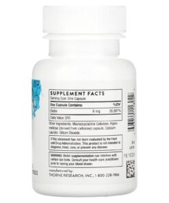 Biotin in a higher amount, such as Is present in Thorne’s Biotin-8, supports glucose metabolism by stimulating glucose-induced insulin secretion in pancreatic beta cells and by accelerating glucose metabolism in the liver. Biotin also enhances muscle insulin sensitivity by increasing uptake of glucose by the muscle cells.