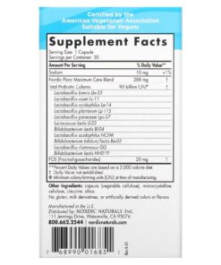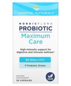Nordic Flora™ Maximum Care is a blend of eleven probiotic strains providing high CFU support for a healthy immune response and optimal intestinal function. With 90 billion CFU in just one capsule, this high-quality probiotic helps alleviate digestive discomfort and supports regularity. Additionally, this formula provides prebiotic FOS to promote probiotic viability and support beneficial microbes naturally present in the gut.
