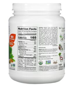 Sunfood protein blend (pea protein*, hemp seed protein*, almond protein*, pumpkin seed protein*), sunfood supergreens blend (spirulina powder [arthrospira platensis]*, chlorella powder [broken cell wall chlorella vulgaris]*, whole leaf wheat grass*, nettle leaf powder*, burdock root*, alfalfa leaf*, kale powder*, horsetail*, parsley leaf powder*, spinach powder*, broccoli powder*, oat grass juice powder*, whole leaf barley grass*, nopal cactus powder*, barley grass juice powder*, dandelion leaf*, probiotic complex [lactobacillus acidophilus, lactobacillus casei, bifidobacterium bifidum, bifidobacterium lactis], enzyme complex [papain (from papaya), bromelain (from pineapple), vegetarian pepsin], kelp powder*, dulse powder*, ginger root*), lucuma powder*, coconut palm sugar*, acacia gum*, guar gum*.