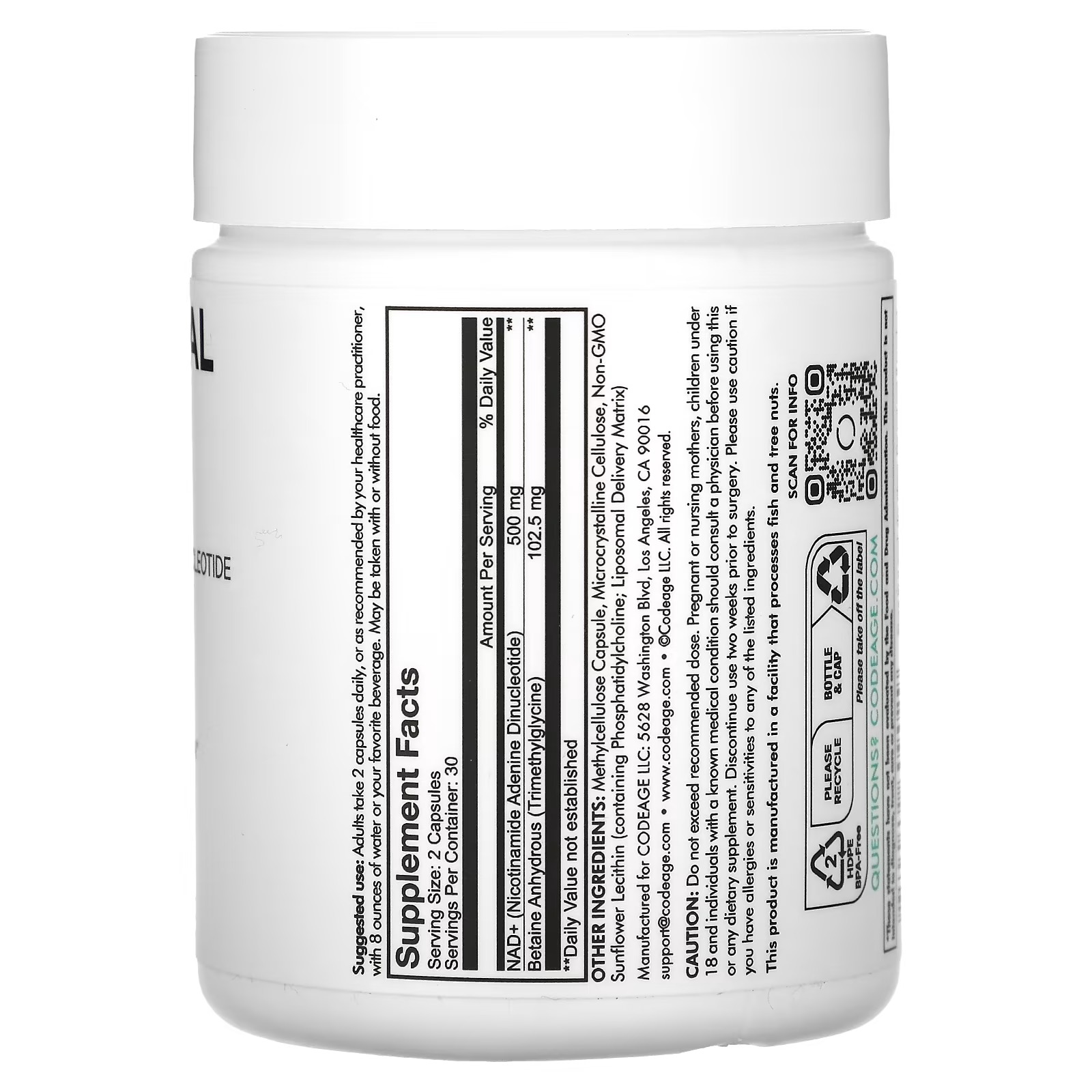 Codeage Liposomal NAD+ supplement offers NAD+ and Betaine Anhydrous with liposomal delivery to help enhance delivery and bioavailability. Nicotinamide Adenine Dinucleotide (NAD) coenzyme may play a role in various cellular processes in the body and help support energy production, metabolism, cells, healthy aging, and overall wellness.